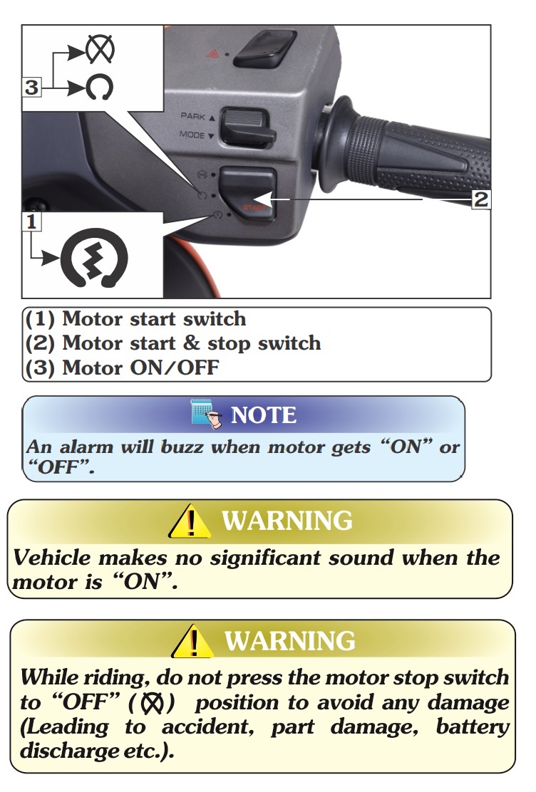Motor start switch | The motor start switch is next to the bi-directional throttle grip. Press the brake lever (either one) and the motor start switch; the motor will start. TFT will display motor “ON” alert (2) on screen. Now you can ride the scooter by simply using the accelerator. See another chapter in this Owner's Manual for the Switching on the Vehicle.