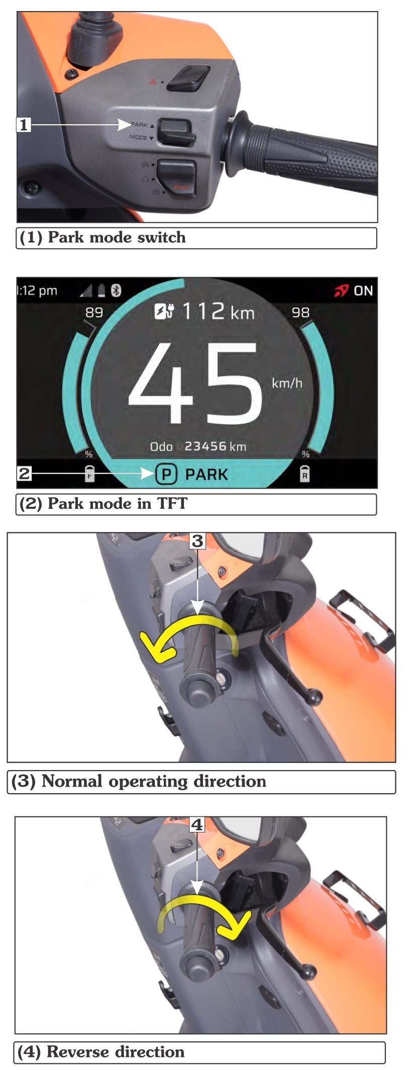 While parking, ensure to press the park mode switch as abrupt throttle inputs may result in sudden wheel spin or jump acceleration