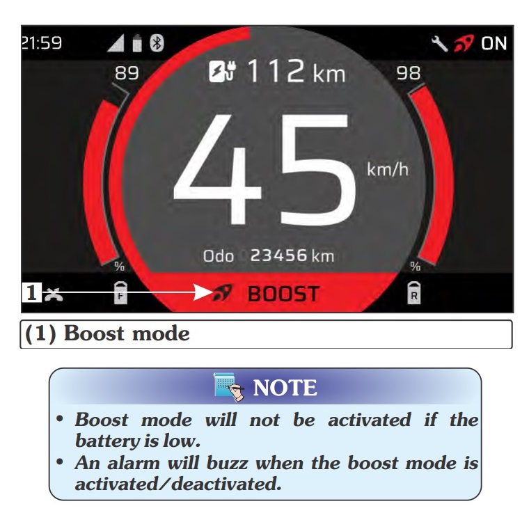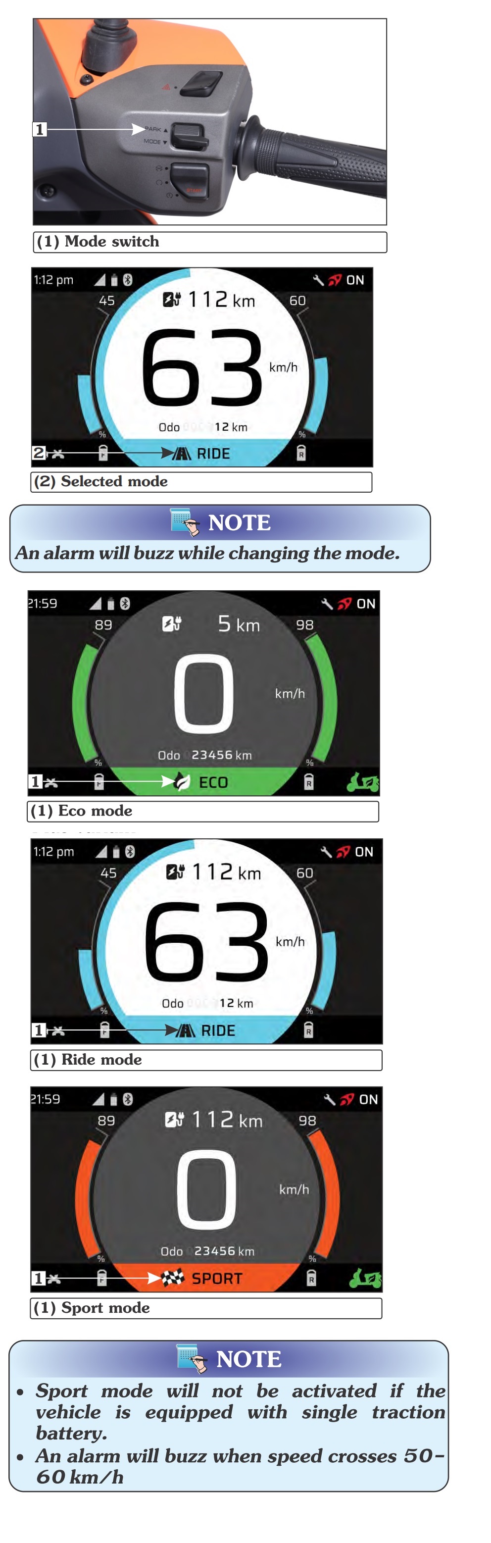 • ECO mode | The ECO mode (1) reduces the acceleration as compared to other modes and maximizes efficiency. Top speed of the vehicle is limited to 45+/-3 km/h.