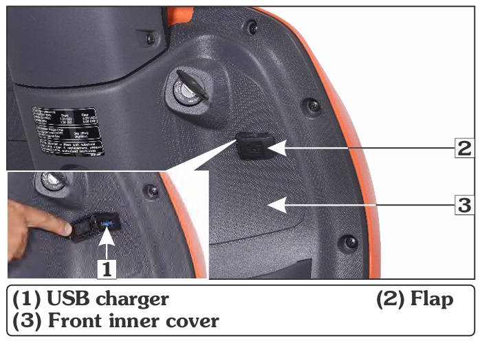 A USB charger (1) with a flap (2) is located on the front inner centre cover (3). This may be used for charging your mobile phone safely while riding.