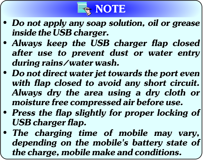 • Always keep the USB charger flap closed after use to prevent dust or water entry during rains/water wash.