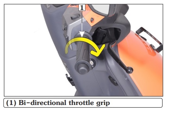 First you need to be on the move and start the vehicle. Twist the bi-directional throttle grip (1) in normal operating direction/counter-clockwise rotation (Right Side view of vehicle) to energize the motor and start the vehicle motion in a forward direction. Release the bi-directional throttle and it will automatically return to the initial position. Now, twist the bi-directional throttle in reverse direction (clockwise rotation) up to the closed position, which will engage re-generative braking while the vehicle is in motion.