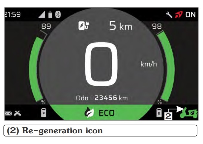 Application of any of the brakes while the vehicle is in motion, will engage the regenerative energy creation. User can also view the re-generation on TFT screen in re-generation icon (2).