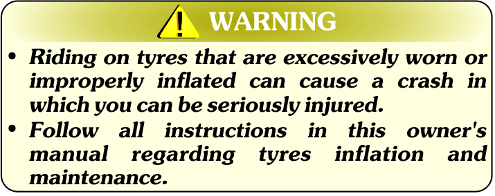 • Riding on tyres that are excessively worn or improperly inflated can cause accidents resulting in serious injuries or even death
