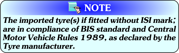 The imported tyre(s), if fitted without ISI mark; should be in compliance of BIS standard and Central Motor Vehicle Rules 1989, as declared by the Tyre manufacturer.